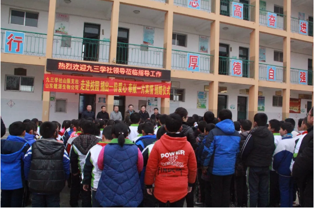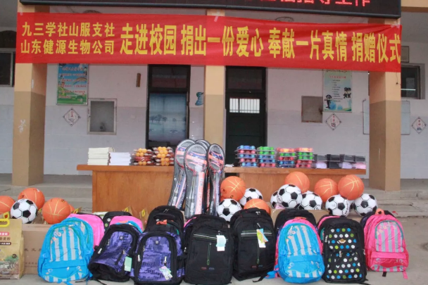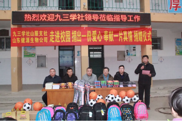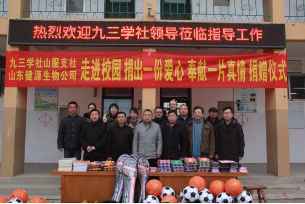 人生之善莫過于助人,助人之德莫過于助學,為積極履行社會責任,關注支持貧困地區教育事業發展,2019年1月11日,九三學社與山東健源生物科技有限公司共同為泰安市高新區化馬灣鄉當地一家小學捐贈了一批體育器材、學習用品及辦公用品,為該校師生送去了社會的關心和溫暖。