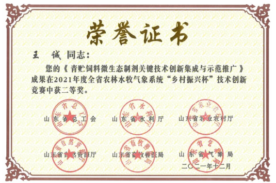 山東省農林水工會委員會印發《關于 2021 年度全省農林水牧氣象系統 “鄉村振興杯”爭先創優競賽工作項目 有關情況的通報》,對遴選出來的先進集體、個人和案例予以通報表揚和獎勵。山東健源生物科技有限公司提報的《青貯飼料微生態制劑關鍵技術創新集成與示范推廣》成果在2021年度山東省農林水牧氣象系統“鄉村振興杯”技術創新競賽中榮獲二等獎。