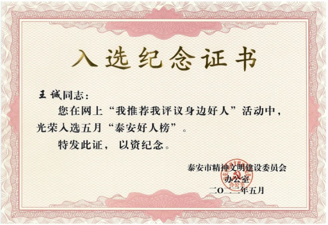 一、王誠董事長光榮入選五月“泰安好人榜”——由泰安市精神文明建設委員會頒發(fā)