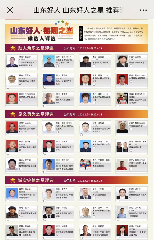 為深入貫徹落實黨的十七屆六中全會精神,推動學雷鋒活動常態(tài)化,推進公民思想道德建設,公民道德素質(zhì)和社會文明程度,努力建設“美德山東”,根據(jù)省委辦公廳《關于深入開展學雷鋒活動的實施意見》(魯辦發(fā)[2012]6號)精神,在全省廣泛開展“山東好人——每周之星”評選活活動由省委宣傳部、省文明辦、大眾報業(yè)集團、省總工會、團省委、省婦聯(lián)、山東廣播電視臺聯(lián)合主辦。山東健源生物科技有限公司王誠董事長被評選為2022年6月(123期)誠實守信類“山東好人”。