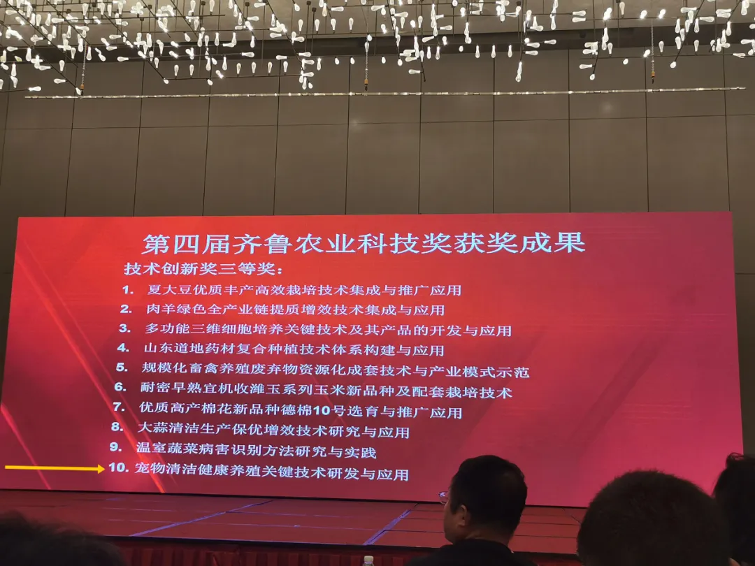 8月30日,第四屆齊魯農業科技獎獎勵大會暨第二屆青年學術論壇在濟南召開,評選出77項2023年度齊魯農業科技獎。山東健源生物科技有限公司與子公司山東寵言生物科技有限公司共同完成的“寵物清潔健康養殖關鍵技術研發與應用”項目榮獲2023年度齊魯農業科技獎技術創新獎三等獎。