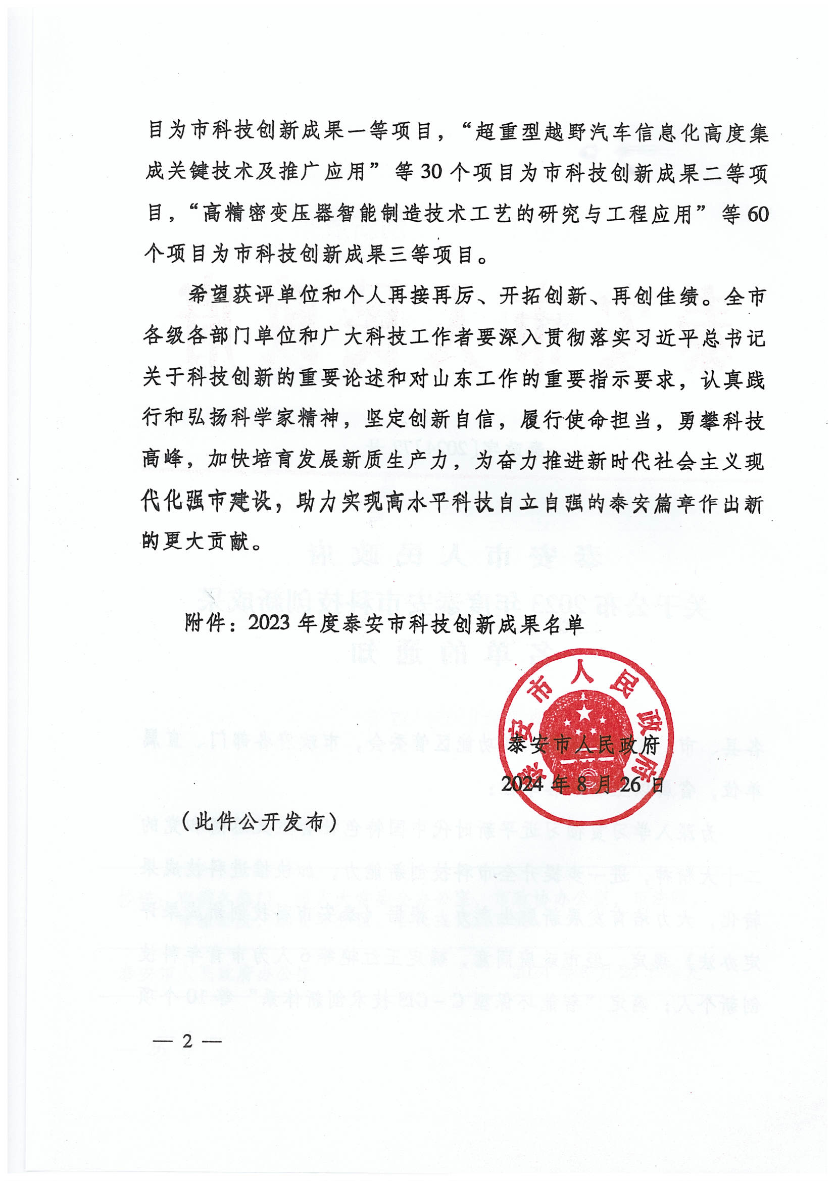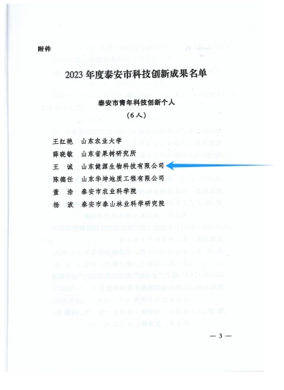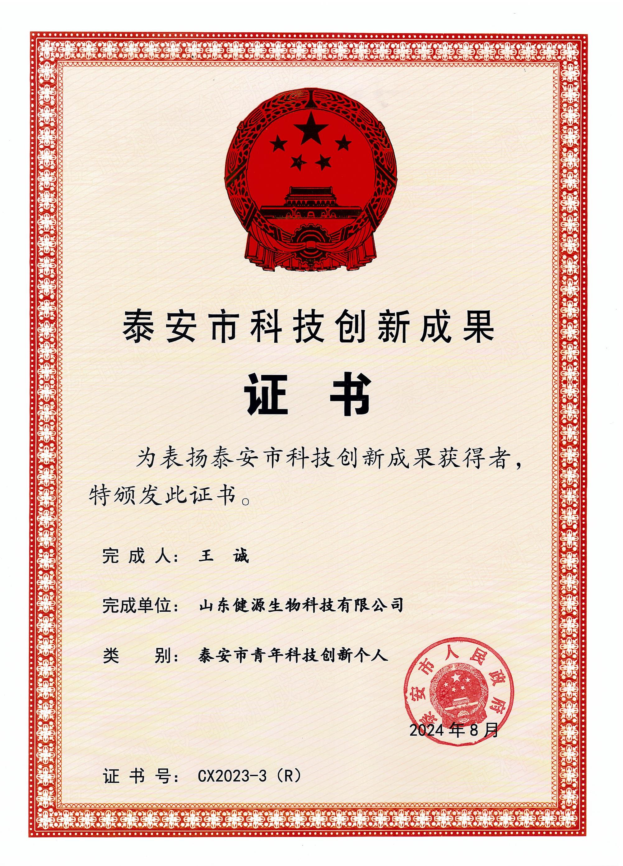 會上宣讀了《泰安市獲2023年度國家、省科學技術獎項目名單》和《泰安市人民政府關于公布2023年度泰安市科技創新成果名單的通知》,為2023年度省科學技術獎獲獎代表及市科技創新成果完成人代表頒發證書。山東健源生物科技有限公司董事長王誠榮獲泰安市青年科技創新個人。