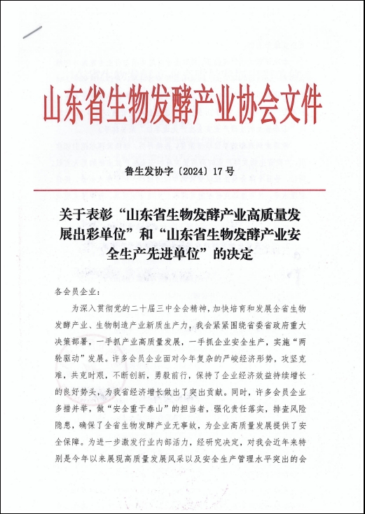 發布時間:[2024-12-19 11:31:42] 瀏覽量:2662次近日,山東省生物發酵產業協會發布關于表彰“山東省生物發酵產業高質量發展出彩單位”和“山東省生物發酵產業安全生產先進單位”的決定,山東健源生物科技有限公司榮獲“山東省生物發酵產業高質量發展出彩單位”稱號。