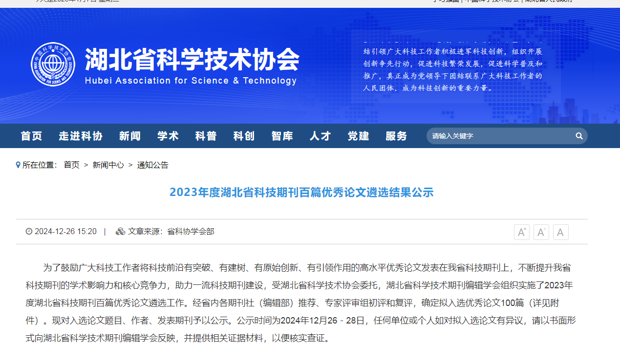 發(fā)布時(shí)間:[2025-1-15 17:6:25] 瀏覽量:2553次2024年12月31日,由湖北省科學(xué)技術(shù)協(xié)會(huì)指導(dǎo),湖北省科學(xué)技術(shù)期刊編輯學(xué)會(huì)組織實(shí)施的2023年度湖北省科技期刊百篇優(yōu)秀論文遴選結(jié)果公布,經(jīng)過評選,山東健源生物科技有限公司董事長王誠帶領(lǐng)研發(fā)團(tuán)隊(duì)撰寫的《菌酶協(xié)同發(fā)酵對玉米秸稈青貯品質(zhì)的影響》論文入選2023年度湖北省科技期刊百篇優(yōu)秀論文。