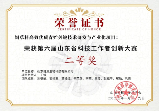 2023-3-3 山東健源生物榮獲第六屆山東省科技工作者創(chuàng)新大賽二等獎(jiǎng)