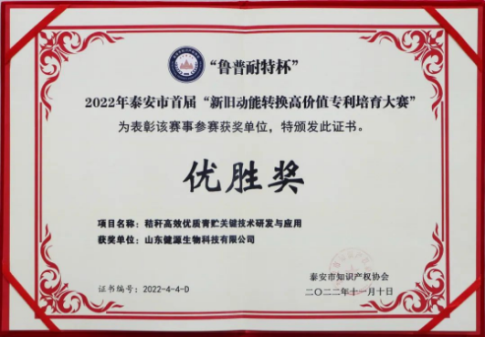 2023-4-4 祝賀山東健源生物榮獲2022年泰安市首屆“新舊動(dòng)能轉(zhuǎn)換高價(jià)值專(zhuān)利培育大賽”優(yōu)勝獎(jiǎng)