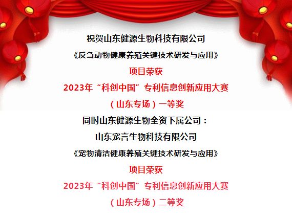 山東健源生物科技有限公司《反芻動物健康養殖關鍵技術研發與應用》項目榮獲2023年“科創中國”專利信息創新應用大賽(山東專場)一等獎,同時山東健源生物全資下屬公司:山東寵言生物科技有限公司《寵物清潔健康養殖關鍵技術研發與應用》項目榮獲2023年“科創中國”專利信息創新應用大賽(山東專場)二等獎。