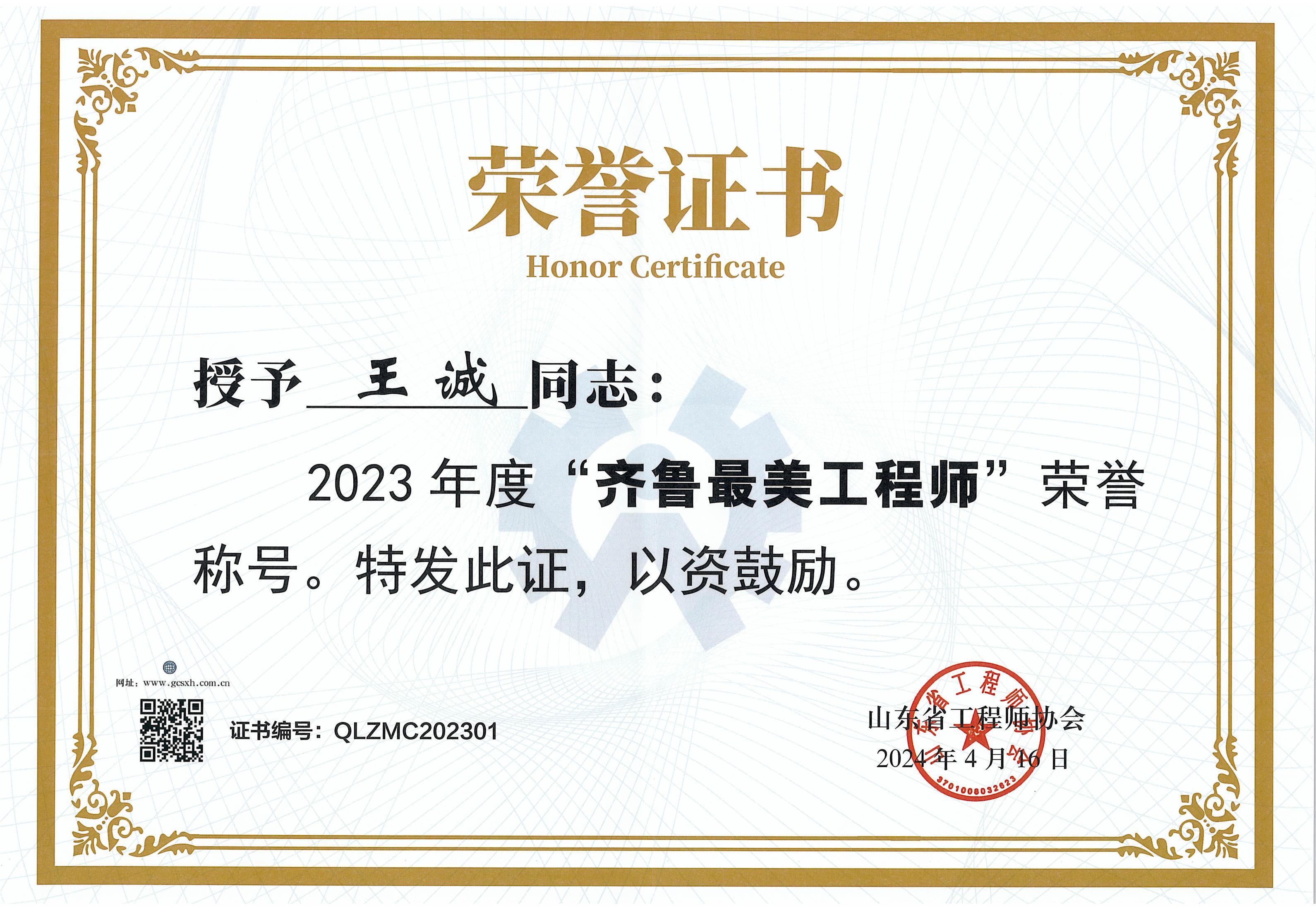 王誠(chéng)董事長(zhǎng)榮獲2023年度“齊魯最美工程師”榮譽(yù)稱號(hào)