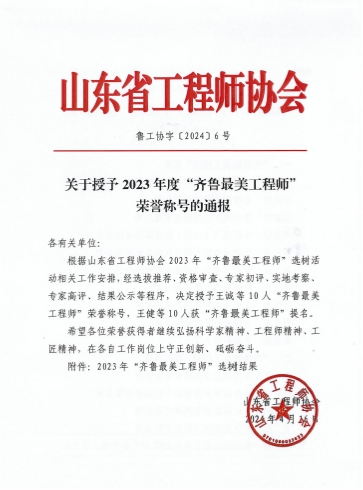 為全面貫徹落實(shí)習(xí)近平總書記關(guān)于人才工作的重要講話精神,大力弘揚(yáng)科學(xué)家精神、工匠精神,激發(fā)動(dòng)員廣大工程技術(shù)人才守正創(chuàng)新、砥礪奮斗。按照中共山東省委人才工作領(lǐng)導(dǎo)小組辦公室《關(guān)于進(jìn)一步加強(qiáng)卓越工程師隊(duì)伍建設(shè)的若干措施的通知》要求,山東省工程師協(xié)會(huì)在全省開展了2023年度“齊魯最美工程師”選樹工作。經(jīng)選拔推薦、資格審查、專家初評(píng)、實(shí)地考察、專家高評(píng)、結(jié)果公示等程序,決定授予王誠(chéng)等10人“齊魯最美工程師”榮譽(yù)稱號(hào)。