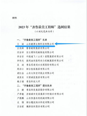 發(fā)布時(shí)間:[2024-7-5 15:51:56] 瀏覽量:3024次近日,山東省工程師協(xié)會(huì)下發(fā)關(guān)于授予2023年度“齊魯最美工程師”榮譽(yù)稱號(hào)的通報(bào),山東健源生物科技有限公司董事長(zhǎng)王誠(chéng)被授予2023年度“齊魯最美工程師”榮譽(yù)稱號(hào)。